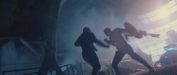Wilson then used the shield to knock Diego, one of the Flag Smashers, out of the pilot seat of a helicopter that he'd hijacked containing GRC members. Afterward, Wilson threw the shield at Karli Morgenthau, Dovich, DeeDee, and Gigi knocking them to the ground on the riverbank, before Wilson stood aslope Bucky Barnes and John Walker.